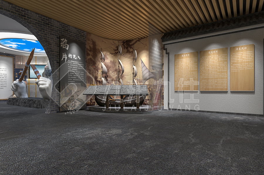 一廳的建筑造型為一個(gè)長方形的走廊,兩側(cè)墻壁上分別展示了毒品的起源和中國禁毒的歷史。毒品的起源部分采用了圖文并茂的方式,介紹了最初的“毒品”是如何出現(xiàn)的,以及毒品是如何隨著歷史的發(fā)展而演變的,讓參觀者了解毒品的歷史淵源和危害性。中國禁毒的歷史部分采用了時(shí)間軸的方式,展示了從張騫出使西域到新中國成立后的禁毒工作的重大事件和成果,突出了中國人民在禁毒斗爭中的艱辛和不屈,以及中國政府在禁毒事業(yè)中的堅(jiān)定立場和主張。兩側(cè)墻壁上還設(shè)有多個(gè)觸摸屏,可以播放相關(guān)的視頻和圖片,增加參觀者的互動(dòng)性和趣味性。一廳的中央是一個(gè)圓形的互動(dòng)滑軌屏,名為《中華之殤——禁毒歷史互動(dòng)游戲》,可以讓參觀者通過滑動(dòng)屏幕上的時(shí)間軸,選擇不同的歷史時(shí)期,觀看相關(guān)的禁毒故事和案例,測試自己的禁毒知識(shí),提高自己的禁毒意識(shí)。